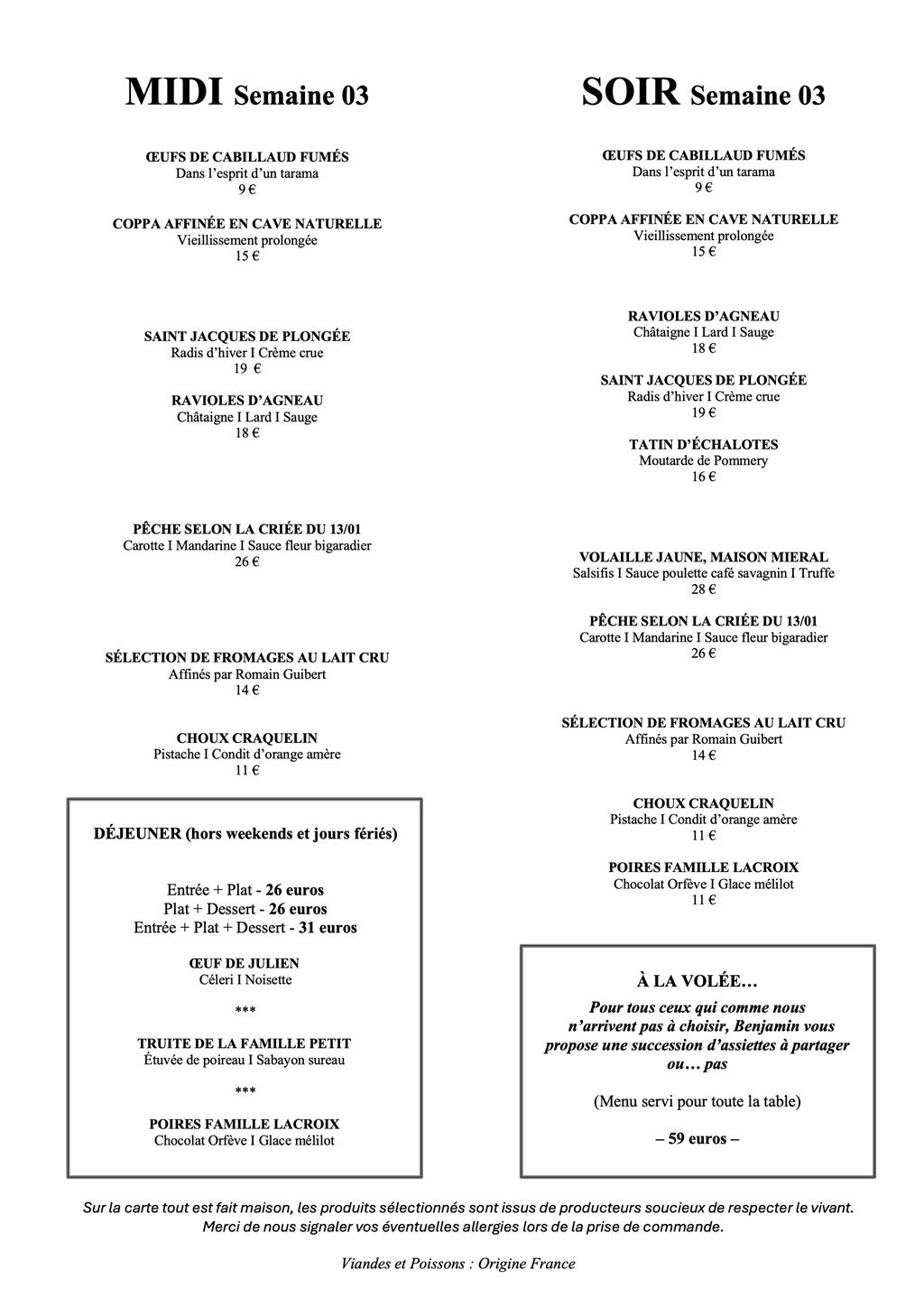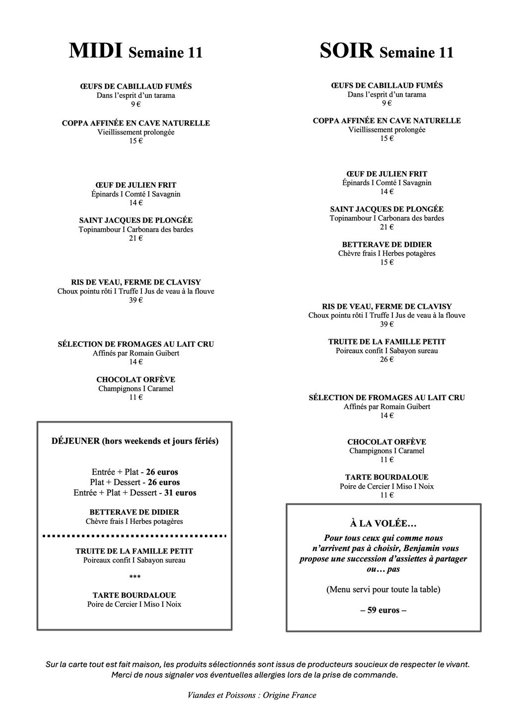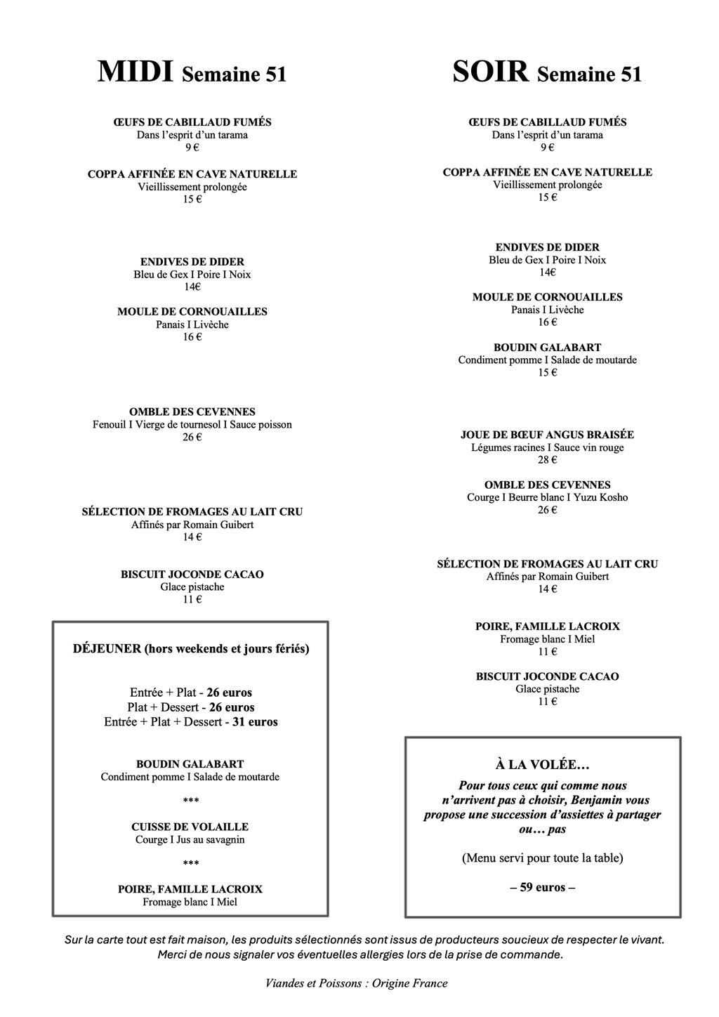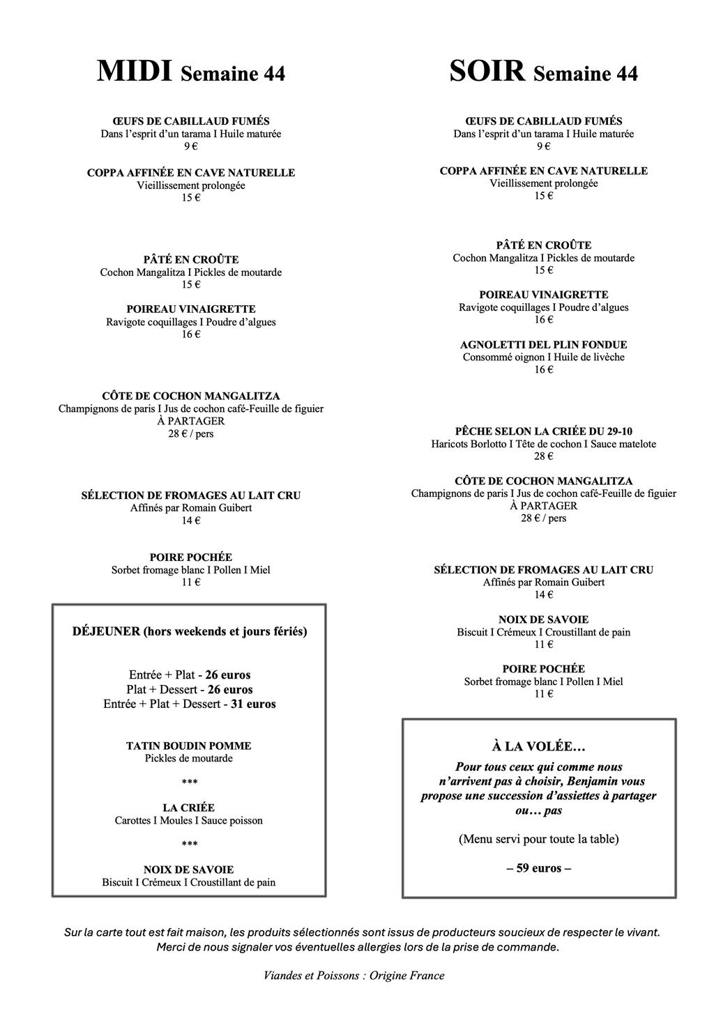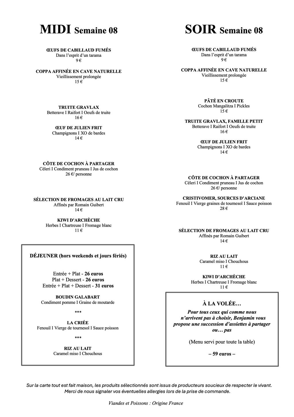 A l’image de notre cuisine, notre cave est en perpétuel mouvement et évolue au fil des rencontres d’hommes et de femmes soucieux du vivant. Ils ont fait le choix de respecter la nature pour en tirer le meilleur, avec l’audace de s’affranchir parfois des stéréotypes de leurs appellations. On trouve de nombreux synonymes pour parler de ces vins : Vins natures, vins libres… ou encore naturels. Néanmoins, définir avec exactitude ces flacons n’a que peu d’importance, puisqu’il s’agit là d’une intellectualisation qui pourrait nous faire passer à côté de l’essentiel : l’émotion. La majorité de notre cave est disponible à l’emporter, mais certaines bouteilles sont à consommer sur place car elles font partie de notre expérience et que nous ne souhaitons pas participer à la spéculation irrationnelle qui s’opère autour de ces flacons.